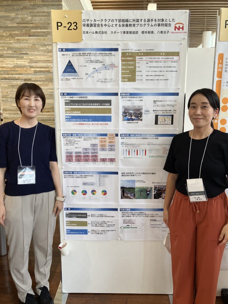 当社所属で北海道日本ハムファイターズとセレッソ大阪の栄養サポートに従事する、公認スポーツ栄養士・八巻法子さんと櫻井郁美さんも参加し、「若手プロ野球選手の試合期における栄養サポートによる除脂肪体重増加の取組み-2024年1~9月の事例報告-」「J1サッカークラブの下部組織に所属する選手を対象とした、栄養講習会を中心とする栄養教育プログラムの事例報告」の内容で実践活動報告を行いました。八巻さんは「学会はスポーツ栄養に関する最新情報が得られ、様々な分野の専門家の経験を共有いただける貴重な場です。今回得られた知見を現場の活動に活かしていきたいと思います。」と語っていました。