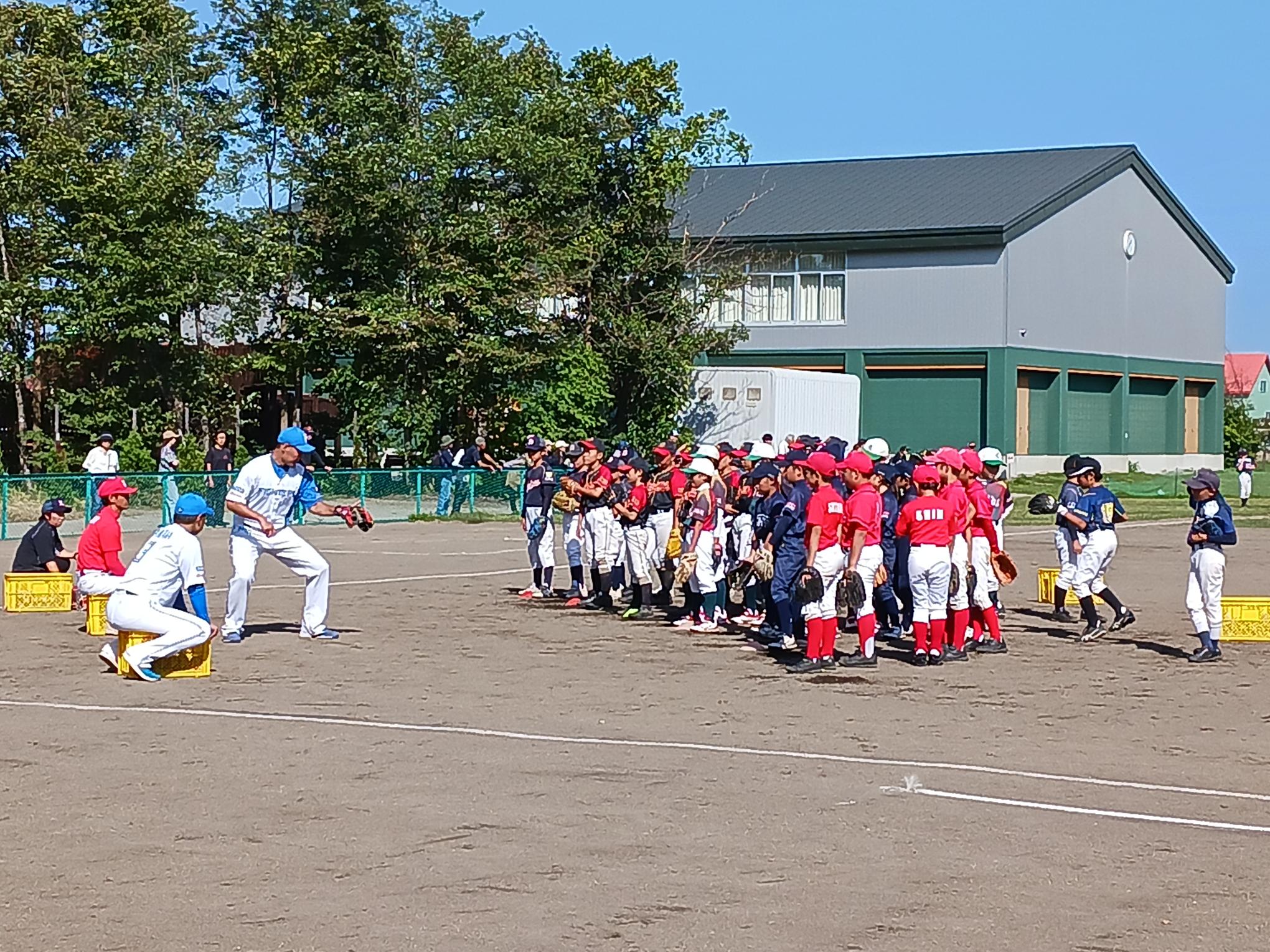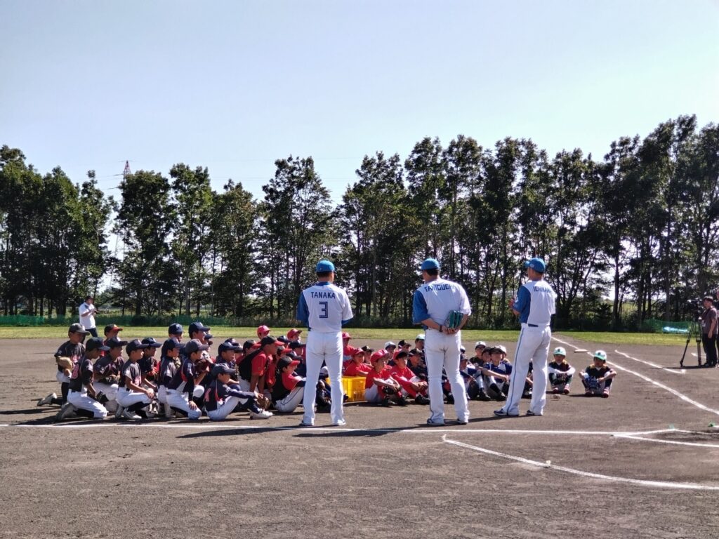 9月15日(祝)、北海道江別市えみくる少年野球場で「Nippon Ham Group Hokkaido Baseball Project」(主催:日本ハム惣菜北海道工場)が開催されました。北海道日本ハムファイターズベースボールアカデミーコーチの市川卓さん、谷口雄也さん、北海道日本ハムファイターズスペシャルアドバイザー(以下SA)の田中賢介さんを講師に迎え、江別市と新篠津村の計7チームから参加した小学4、5年生約70名に守備や打撃の指導がされました。北海道日本ハムファイターズSA田中賢介さんからの「どんな時でも、緊張感を持って練習することが大切」と呼びかけに子どもたちは真剣な表情で耳を傾けていました。