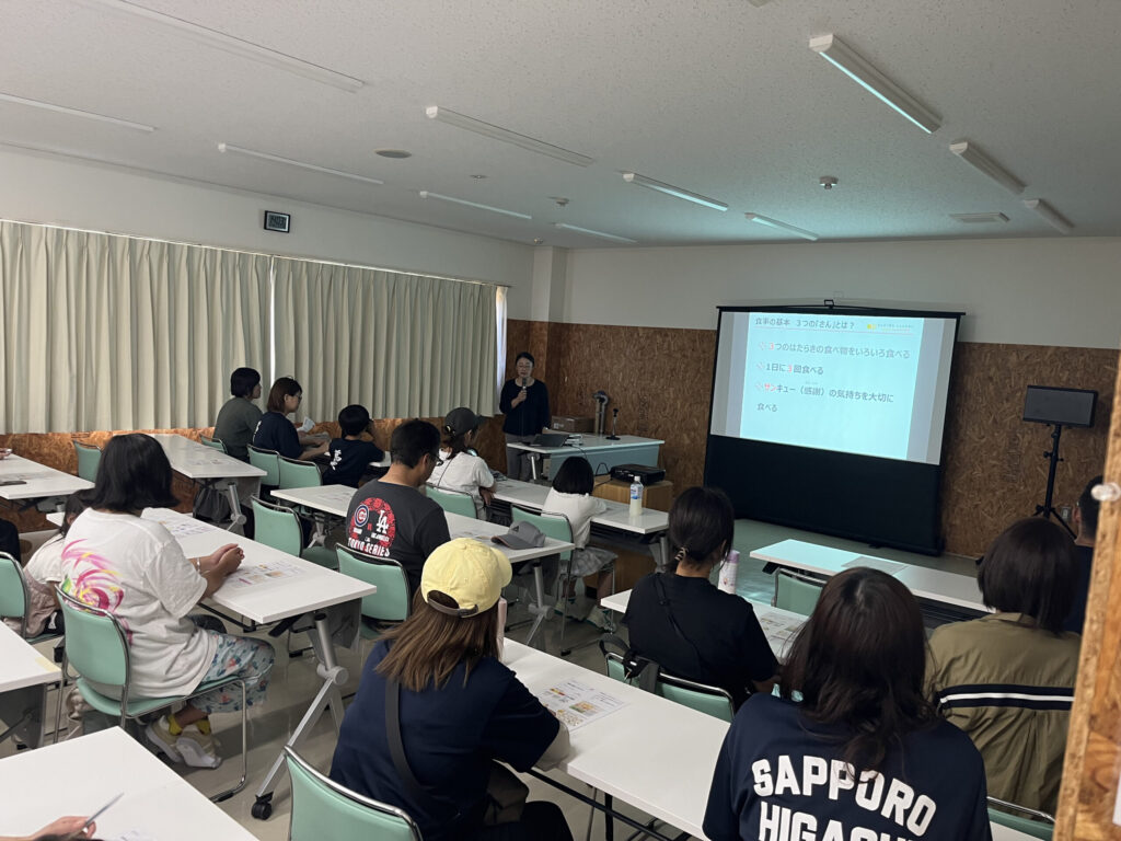 研修室では、保護者や指導者約70名を対象として公認スポーツ栄養士から食育教室も行われました。