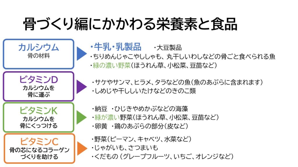 骨づくりに関わる栄養素は、骨の材料となるカルシウム、カルシウムの吸収を助けるビタミンD、カルシウムの骨への沈着を助けるビタミンK、骨の芯となるコラーゲンづくりを助けるビタミンCが必要です。